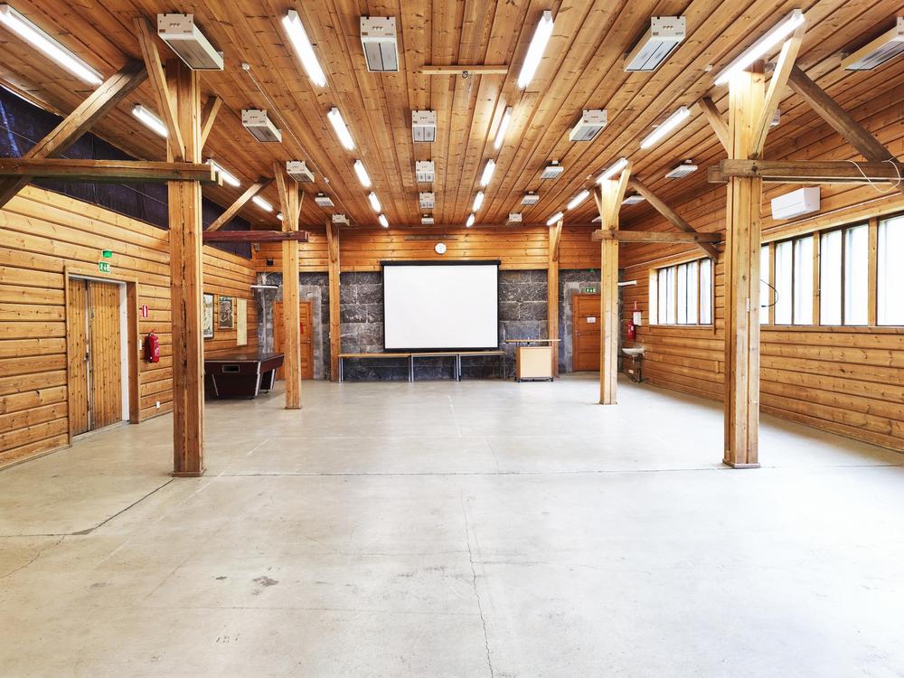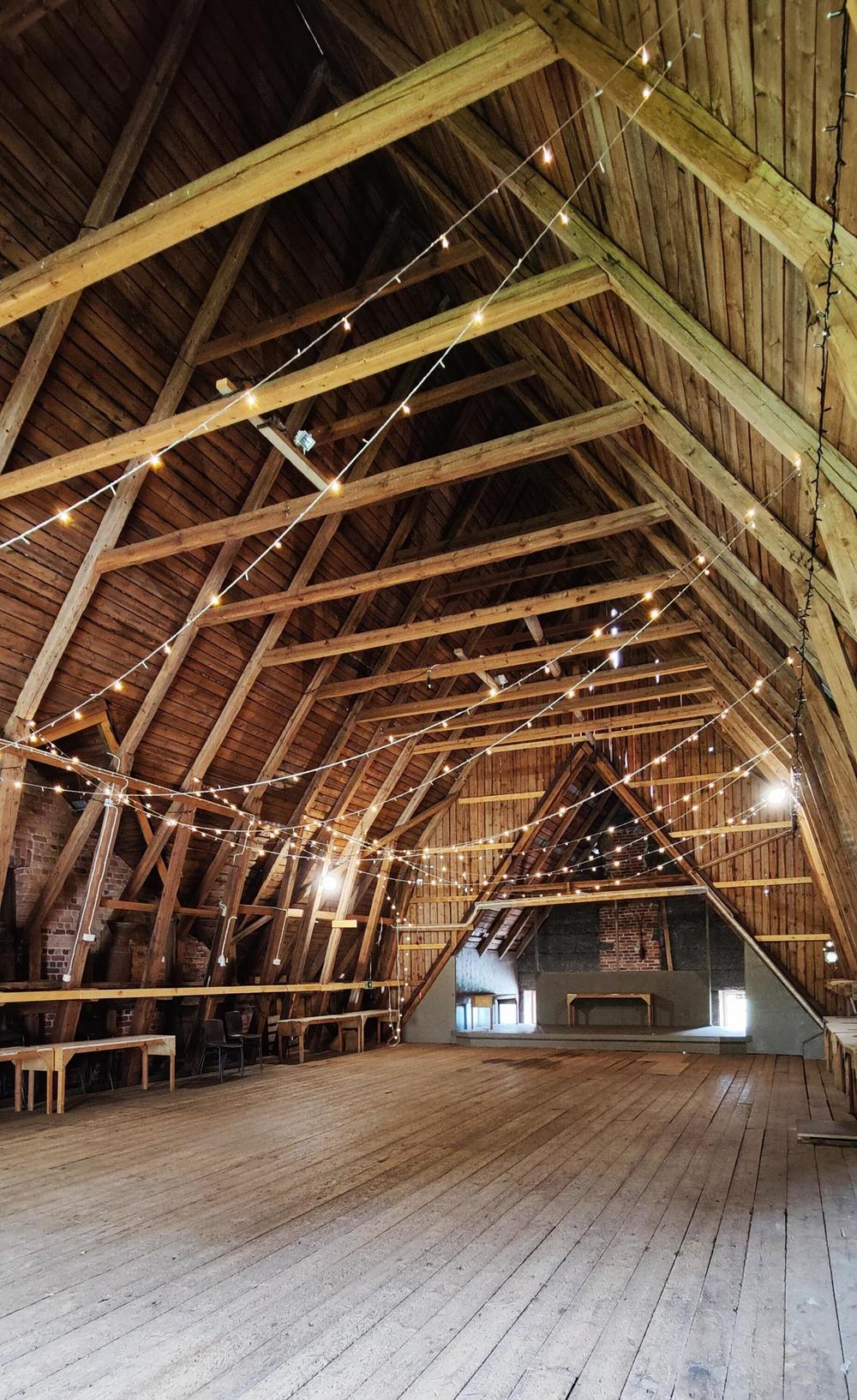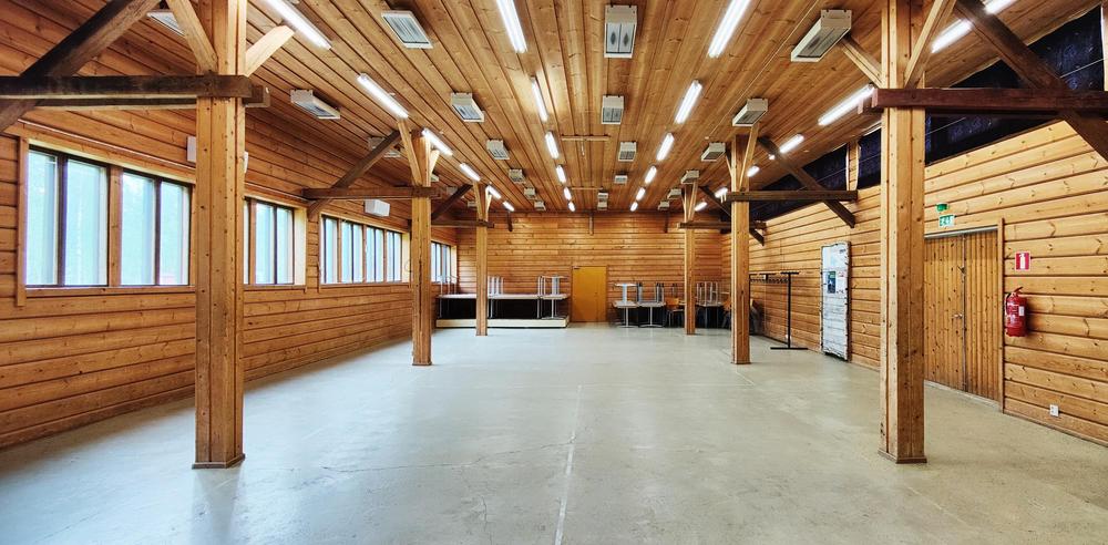 Alakerta, sali 200m2 Samanlaiset siistit pöydät ja tuolit 120 henkilölle. Muita tuoleja ja pöytiä lisää tarpeen mukaan. Jakelukeittiö juhlaruokailun hoitamiseksi Siistit, tilavat WC-tilat. Myös INVA Siirrettävä esiintymislava Yläkerta, "lato" 250m2 Esiintymislava tunnelmallinen valaistus reunoilla pöytiä ja muovituoleja noin 100kpl.