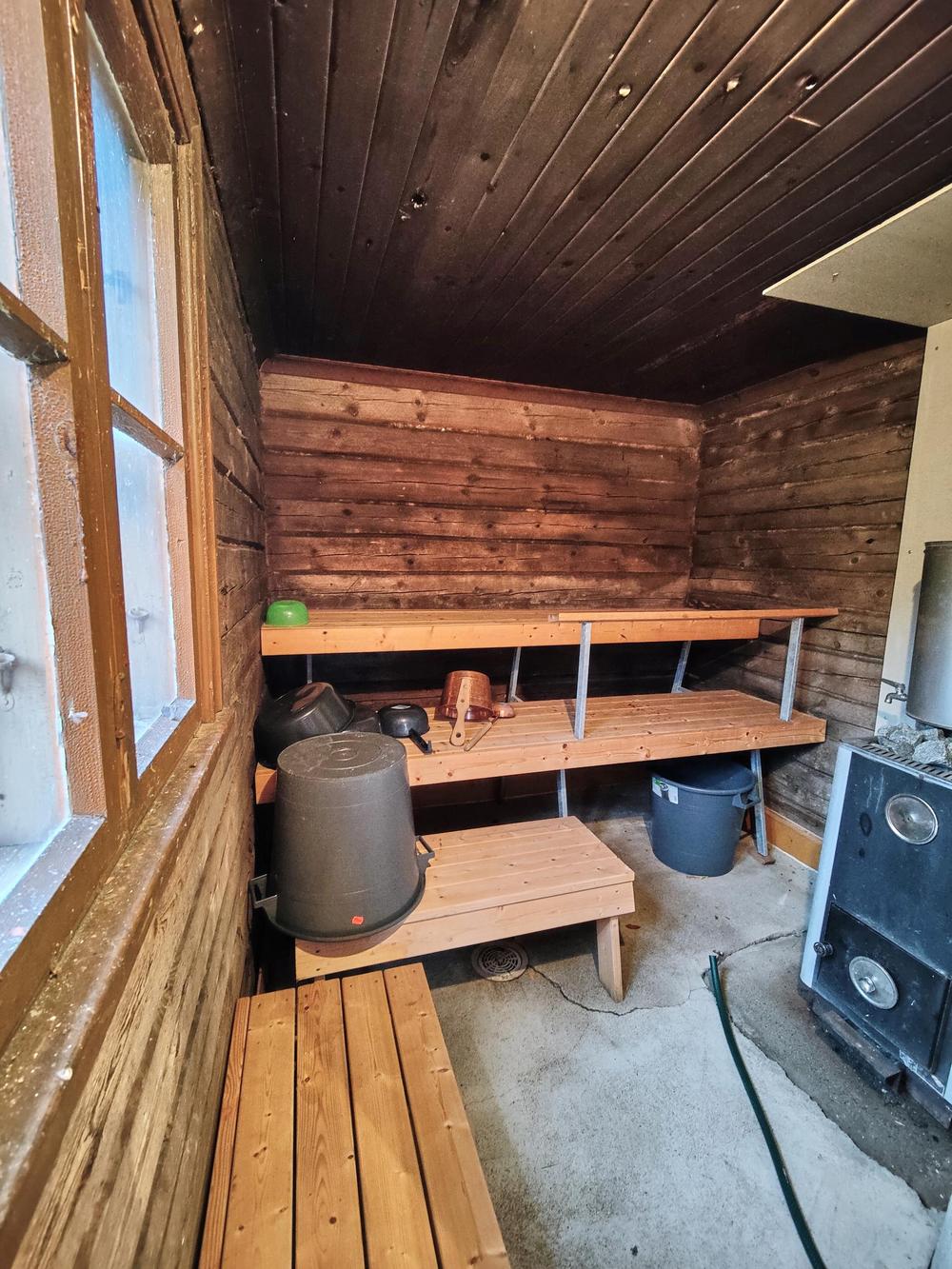 Tilat: Sali, eteinen, kahvio, keittiö, ulkohuussi, ulkosauna, kota