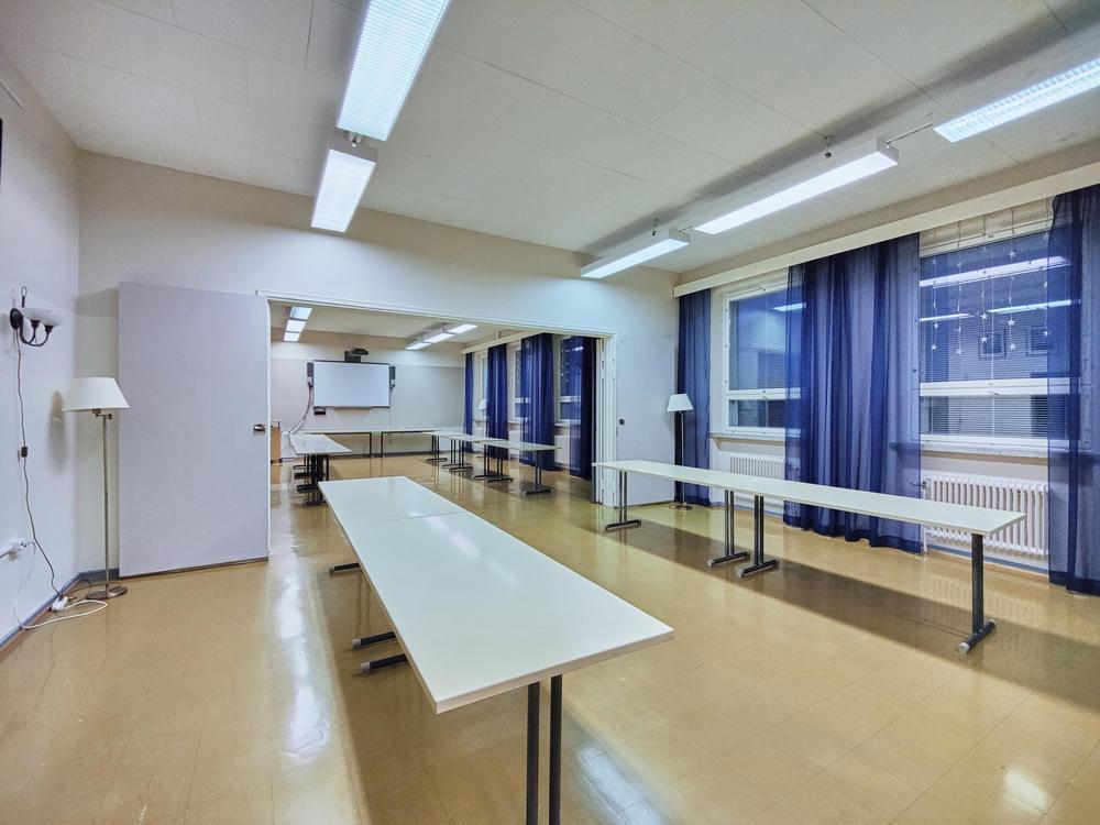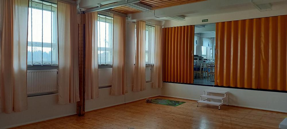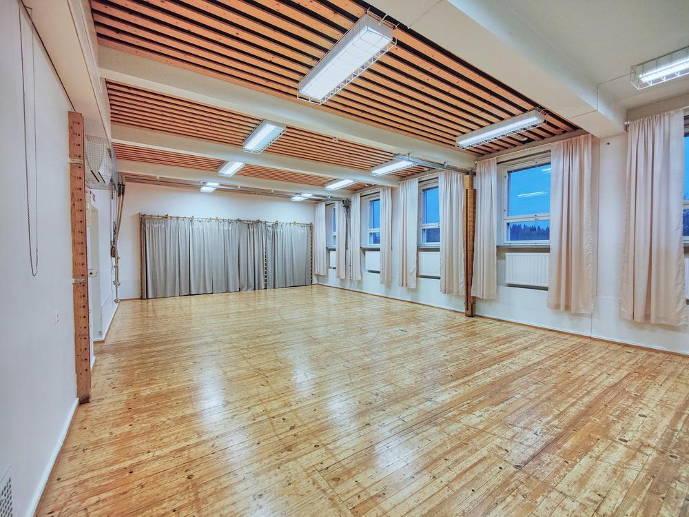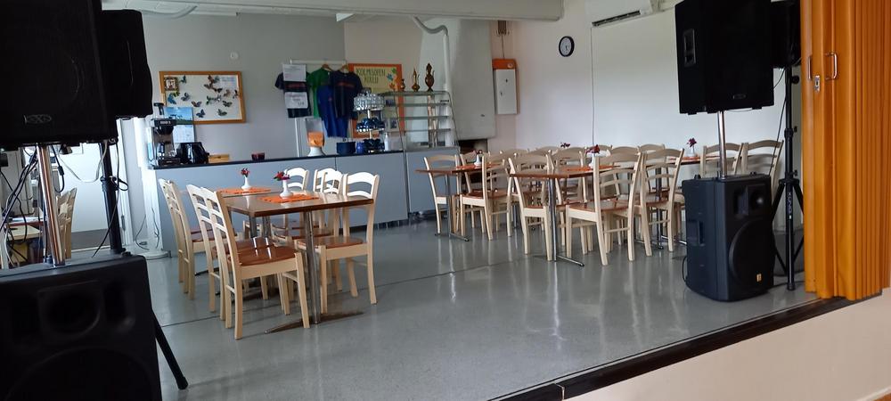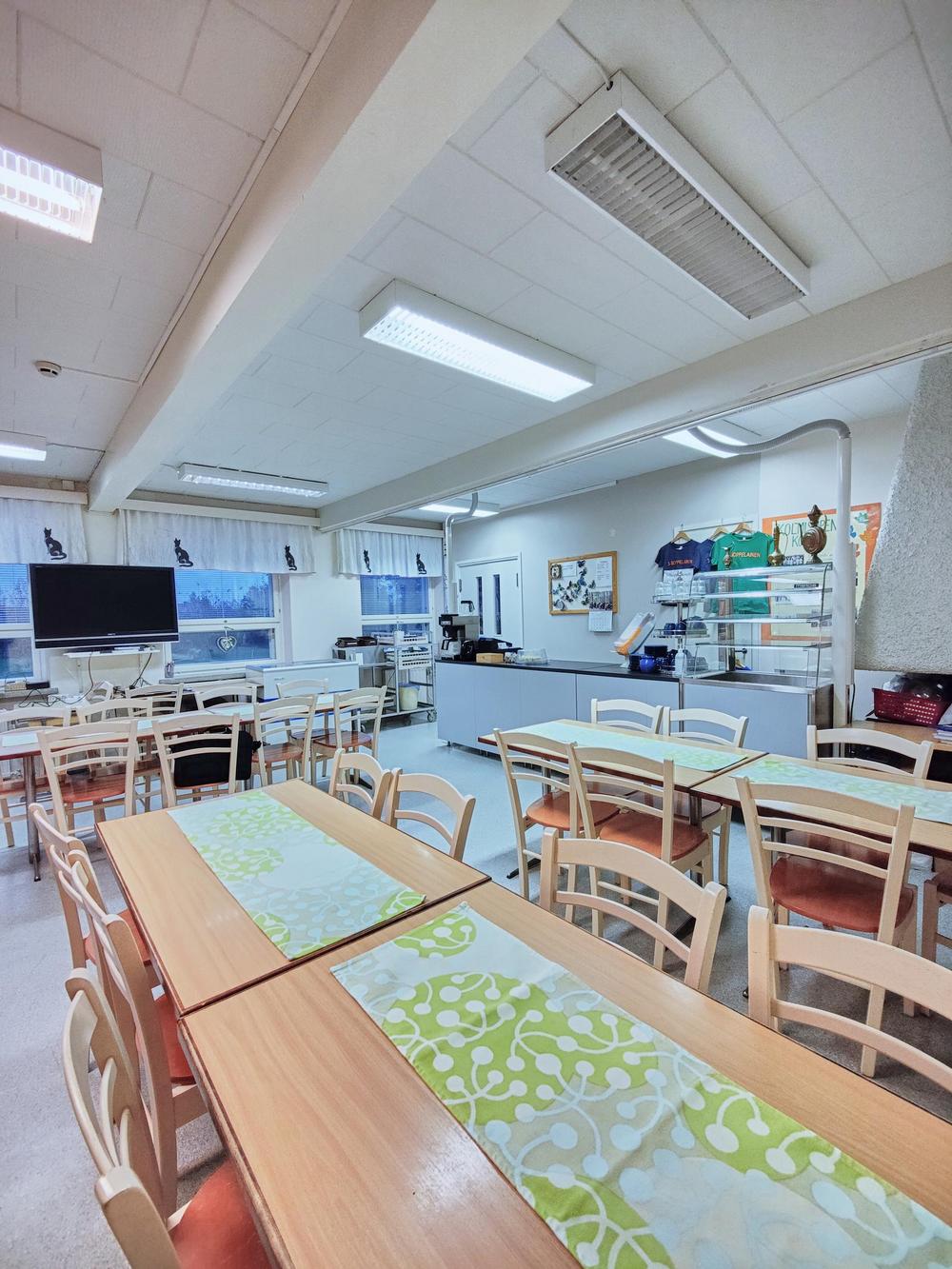 Tilat: Kaksiosainen sali, kahvio, keittiö, eteinen, liikuntasali, wc:t,