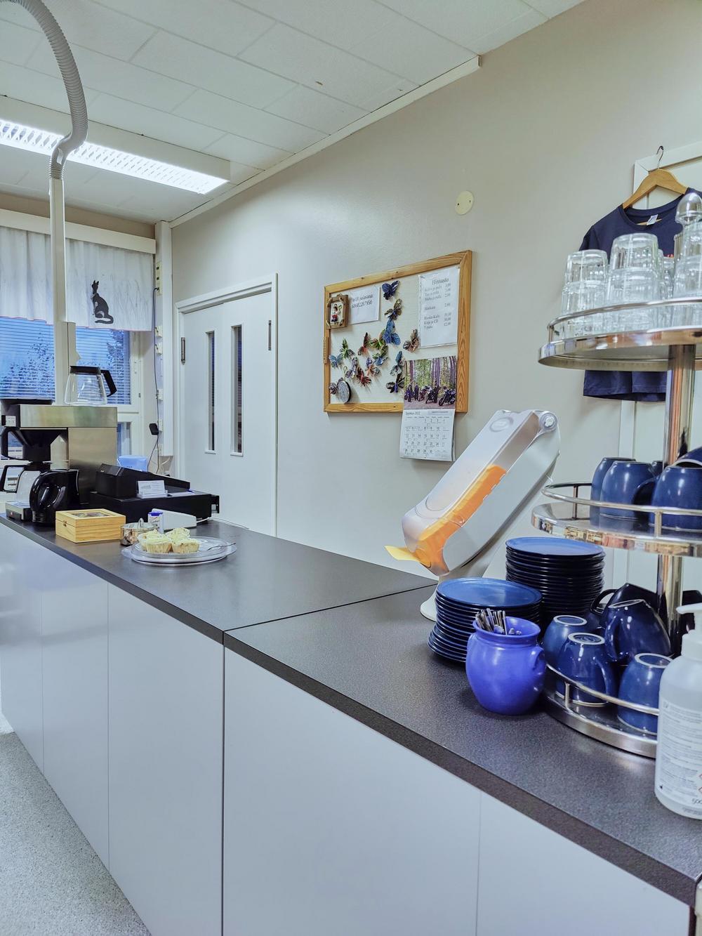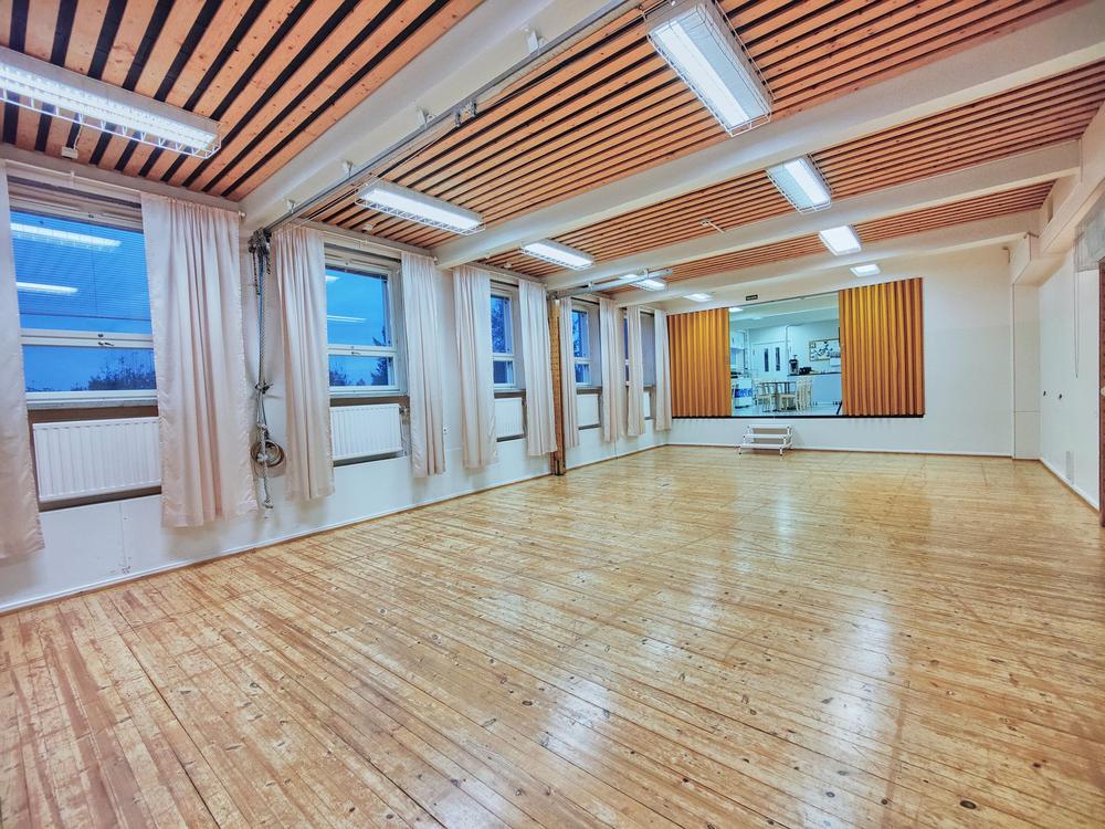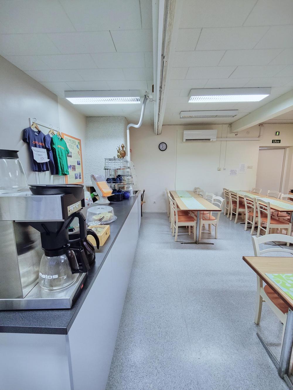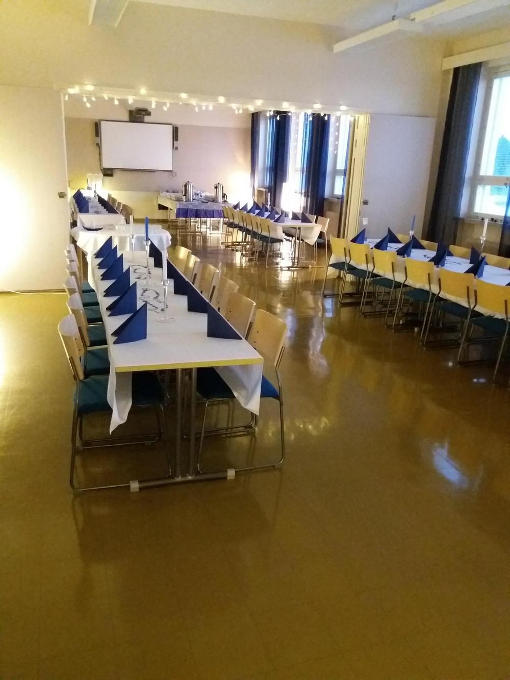 Tilat: Kaksiosainen sali, kahvio, keittiö, eteinen, liikuntasali, wc:t,