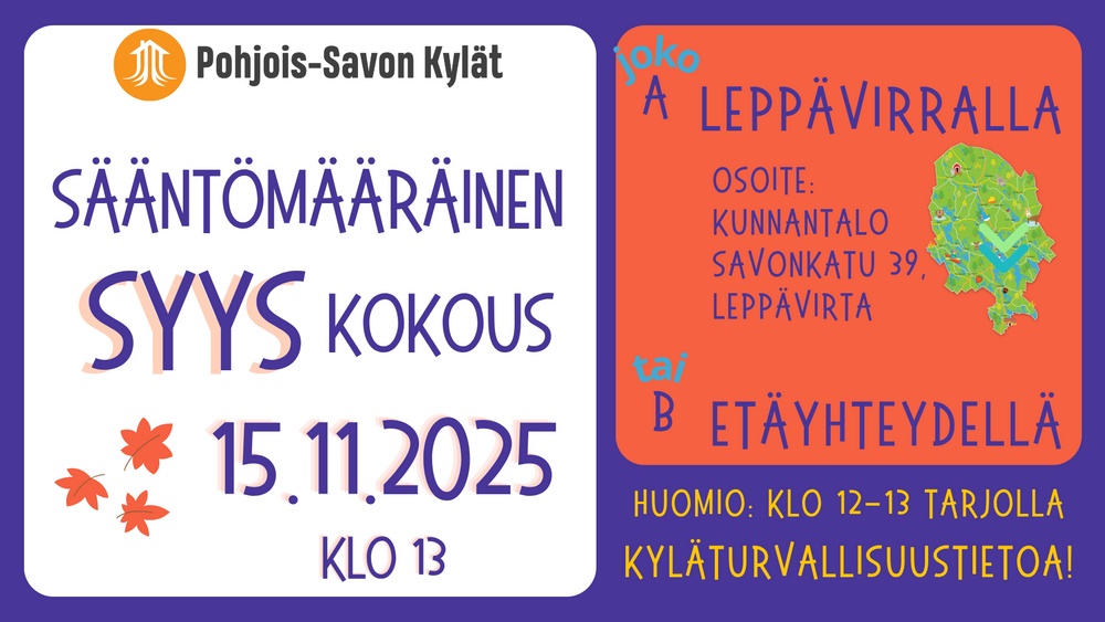 ILMOITTAUTUMISET 14.11.2025 klo 12 mennessä - ottamalla yhteyttä toiminnanjohtajaan: sari.vainikainen()pohjois-savonkylat.fi.kerro, osallistutkoa) sekä kyläturvallisuusinfoon klo 12-13 että…