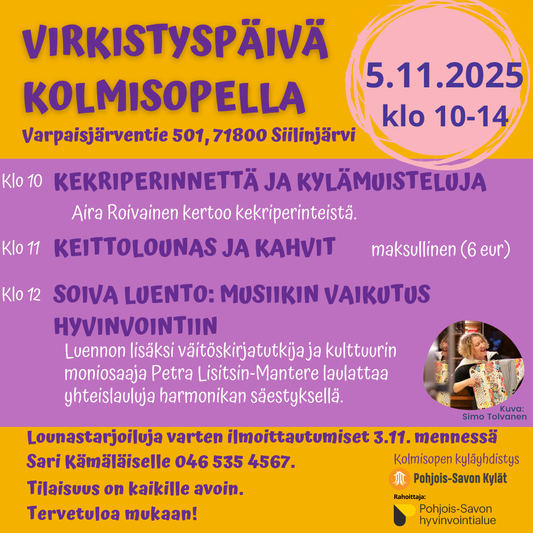 Ohjelmassa - kekriperinteen muistelua klo 10-11. - lounas (6 eur) klo 11-12 - soiva luento klo 12-14 Tapahtuma on kaikille avoin - tervetuloa mukaan, vaikka kauempaakin. Ilmoittautuminen 3.11.…