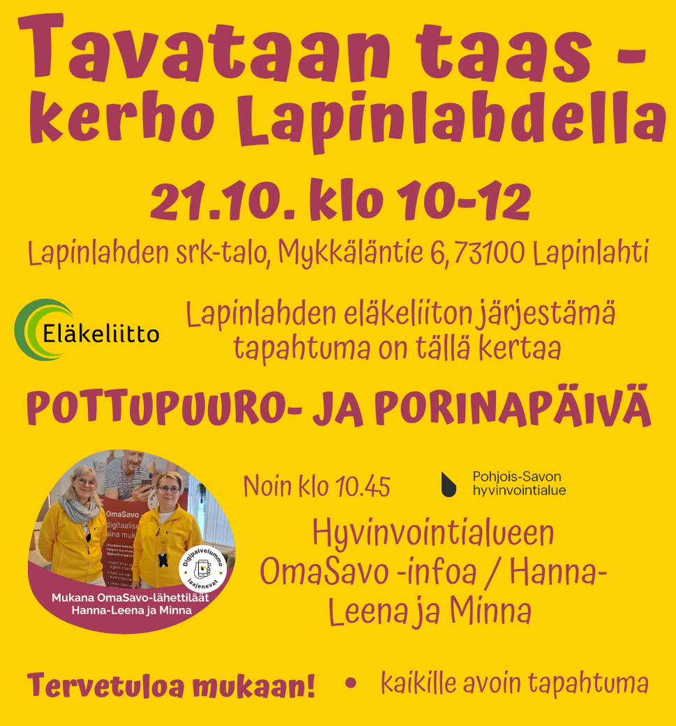 Tapahtuma on tällä kertaa Pottupuuro- ja porinapäivä, ja sen toteuttaa Lapinlahden Eläkeliitto-