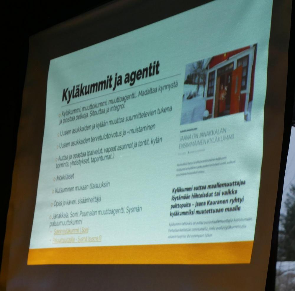 Maallemuuton moninaisuudesta ja erityispiirteistä oli kertomassa Suomen Kylät ry:n maallemuutonasiantuntija Johanna Niilivuo. Voisiko tulevaisuudessa olla enemmän minitaloja, miten saisimme kunnat mukaan muuttamaan vapaa-ajanasuntoja pysyviksi asunnoiksi ja miten kyläkummi voi edesauttaa kylälle muuttavaa. Johanna Niilivuon materiaali löytyy muun syyskokous materiaalin kanssa kotisivuiltamme tästä linkistä: https://www.pohjois-savonkylat.fi/pohjois-savon-kylat-ry-toiminta/kevat-ja-syyskokoukset/syyskokous-2022/ Kotisivuilta löytyy syyskokouksessa hyväksytty toimintasuunnitelma ja talousarvio vuodelle 2023.